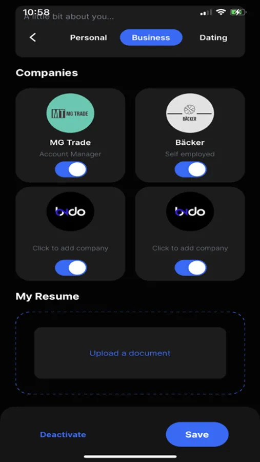 Customize your profile and share your card with anyone. In just a couple of steps, you can modify, create and customize your online experience. With the main purpose of making your profile truly yours.