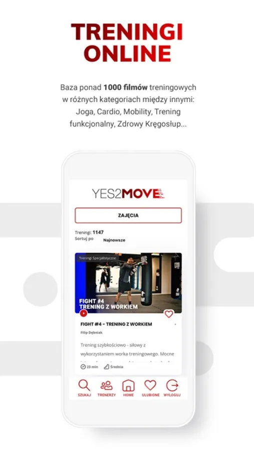 Yes2Move to baza ponad 1000 różnorodnych treningów online - największa platforma treningowa w Polsce. Na Yes2Move znajdziesz przygotowane przez specjalistów i ekspertów od zdrowego ruchu zestawy treningowe.