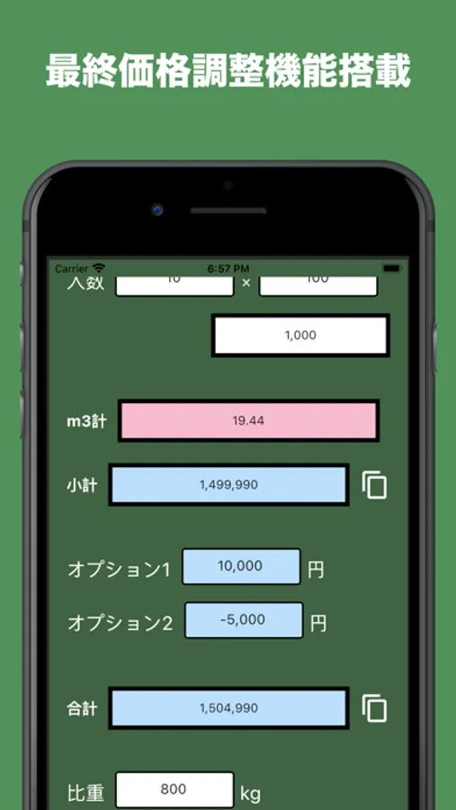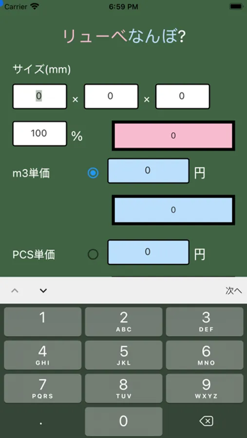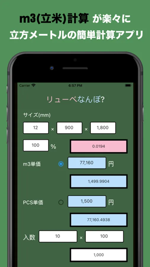 m3(立米)計算が楽々に立方メートルの簡単計算アプリです。その名も「リューベなんぼ?」木材やコンクリートなどの質量計算にお役立てください。これまで電卓や計算機で桁が間違った答えがでて再入力を何度もした経験から、入力した数値を可視化してミリメートルで入力できる事により、計算入力を簡素化。立米単価→個単価、個単価→立米単価を簡単算出。オプションで運賃加算や値引き減算などもラクラクです。比重を入力すれば総重量もわかります。