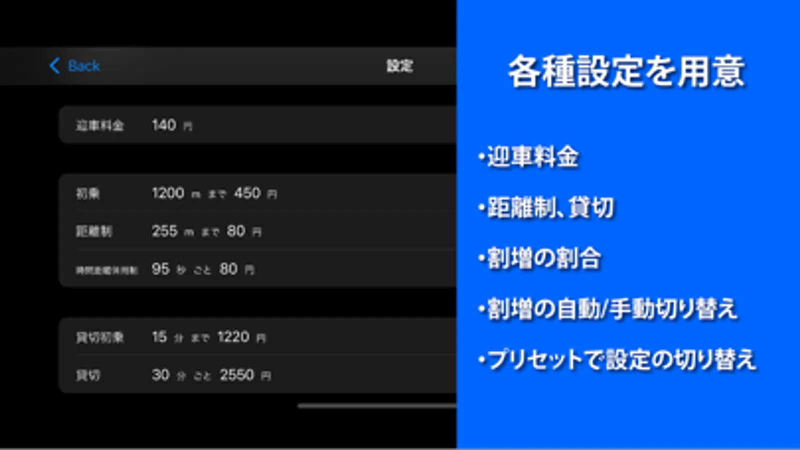 ・各種距離や料金を設定できます