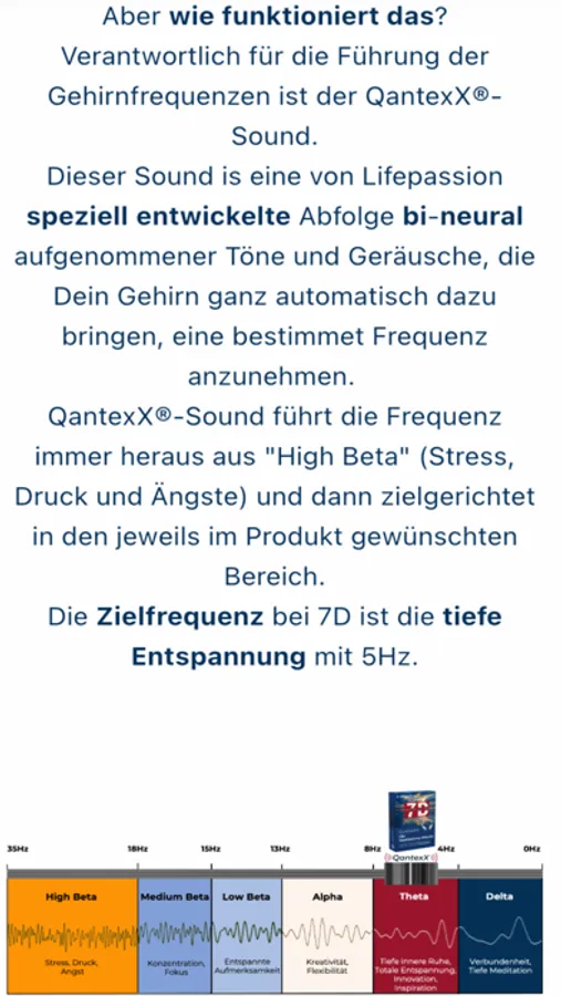 QantexX® führt die Gehirnfrequenz technisch in genau den jeweils gewünschten Bereich. So kommst Du je nach Produkt in tiefe Entspannung, Kreativität, Konzentration oder Tiefschlaf.