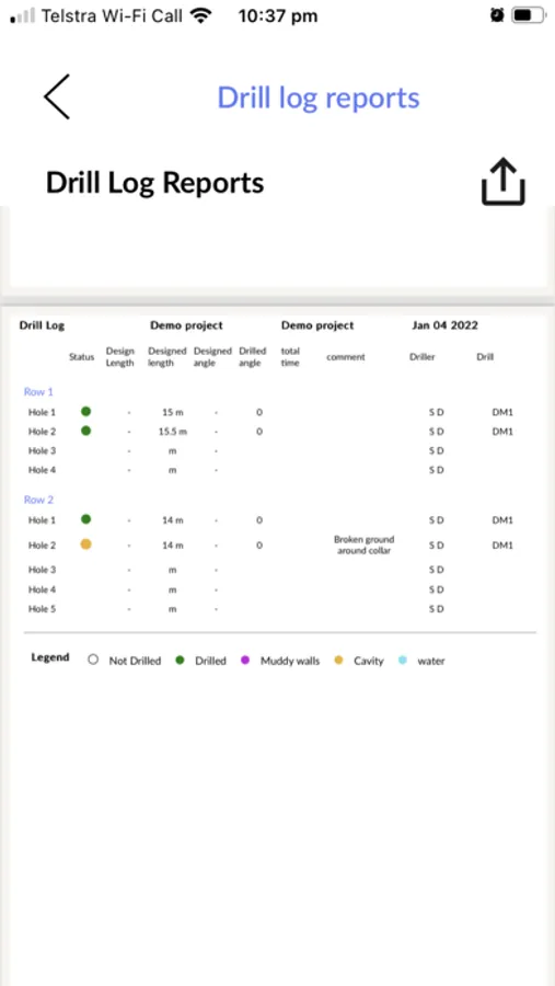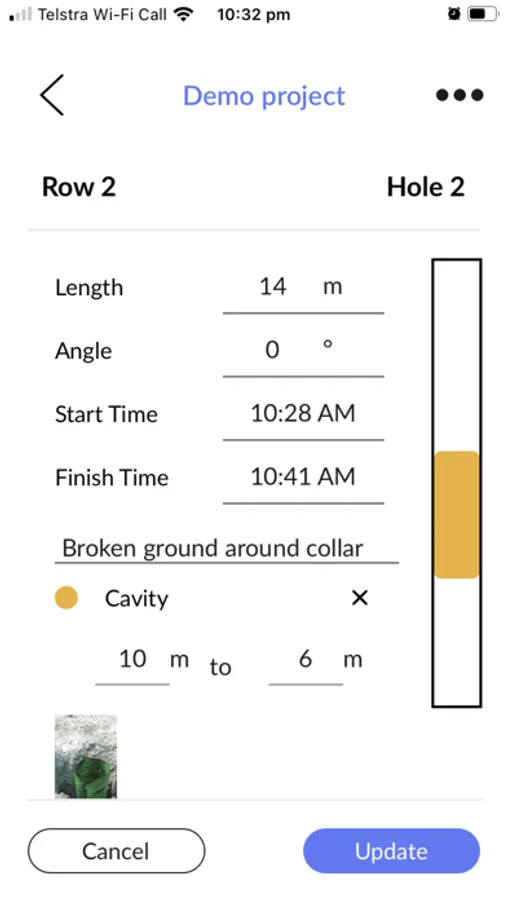 - Rich hole data. Capture hole length, angle, start/finish times, hole photos, water, cavities, comments and more.