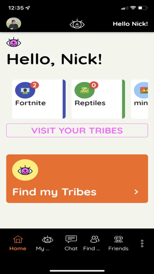 Kaboose opens to the home screen, where you can navigate to ‘find your tribe’.