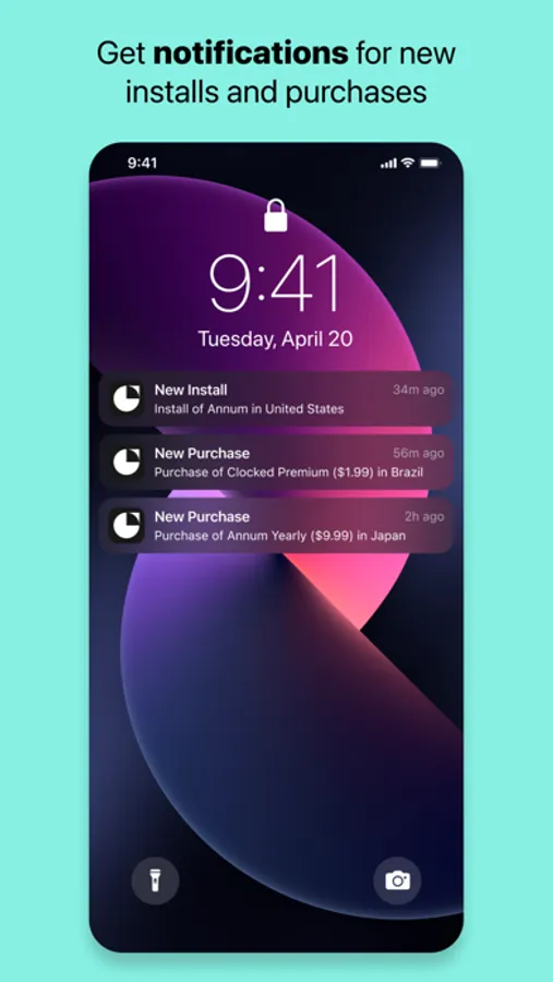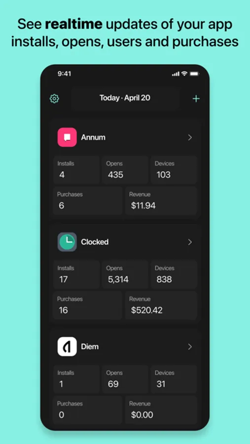 With just one line of code in your app, Pies tracks installs, app opens, users, and revenue—and notifies you as it happens.