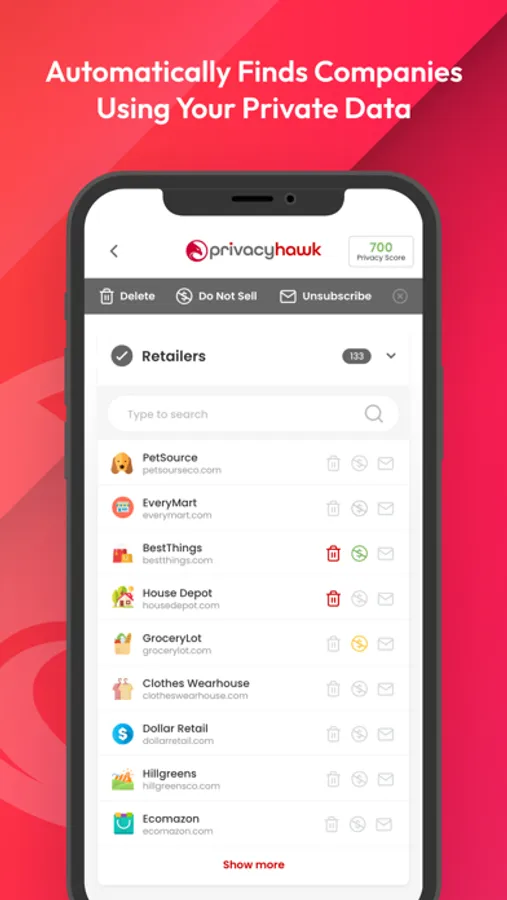 PrivacyHawk automatically finds companies exposing, exploiting or selling your data, gives you control over how it is used, and sends emails to delete, make do not sell requests, and unsubscribe from marketing emails on your behalf.