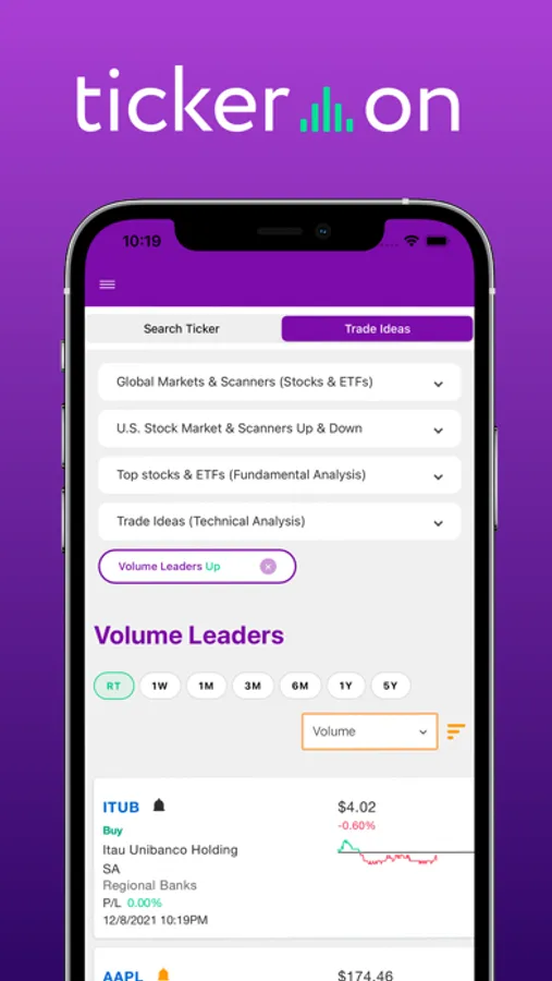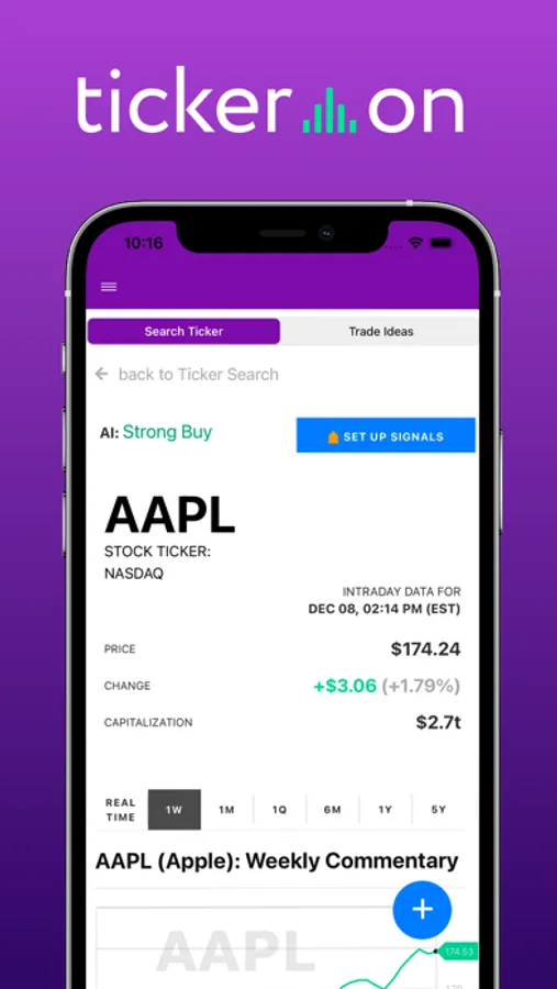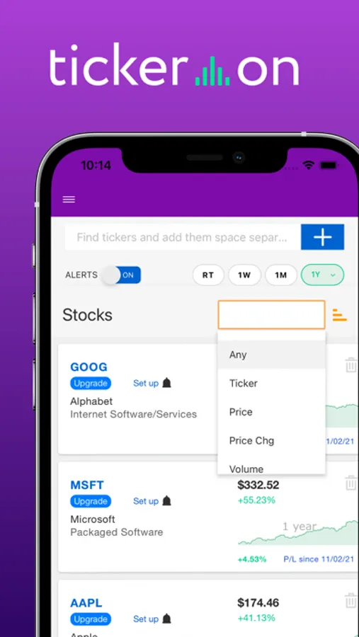 Tickeron's Stock Signals (Alerts) gives you customizable alerts for stocks, ETFs, and other asset classes. You can set up notifications for a specific price, change by %, or volume.