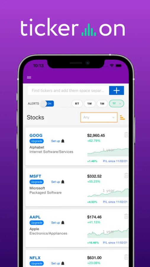 Create stock watchlists with personalized live stock market signals and buy and sell recommendations. Filter by earnings and dividend reports, and insider trading.