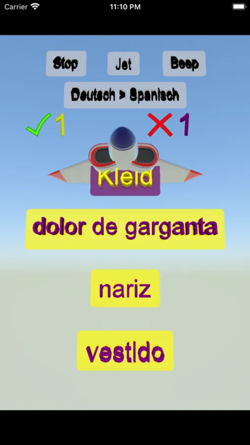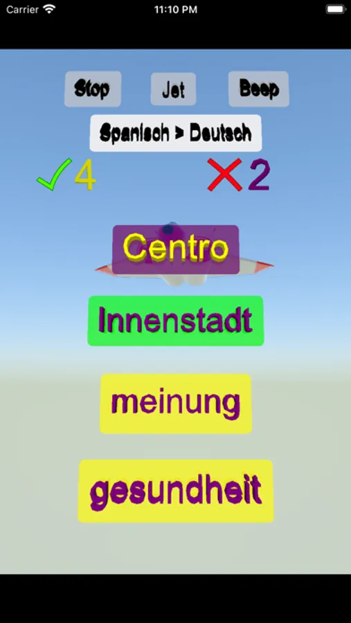 Sie sehen oben ein Wort und Antworten unterhalb des Wortes. Sie sehen einen grünen Rahmen, wenn Sie die richtige Antwort auswählen. Sie können das Spiel von Deutsch auf Spanisch und von Spanisch auf Deutsch ändern. Mit richtigen Antworten können Sie Ihre Punkte erhöhen.