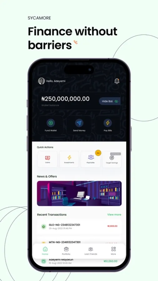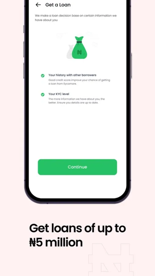 The Sycamore Mobile App is an innovative financial solution designed for you to meet your money needs. Get quick access to collateral-free personal loans from N100,000 - N5 million and N500,000 - N5 million for business loans, lend money from friends or borrow, invest and earn competitive returns, and pay bills