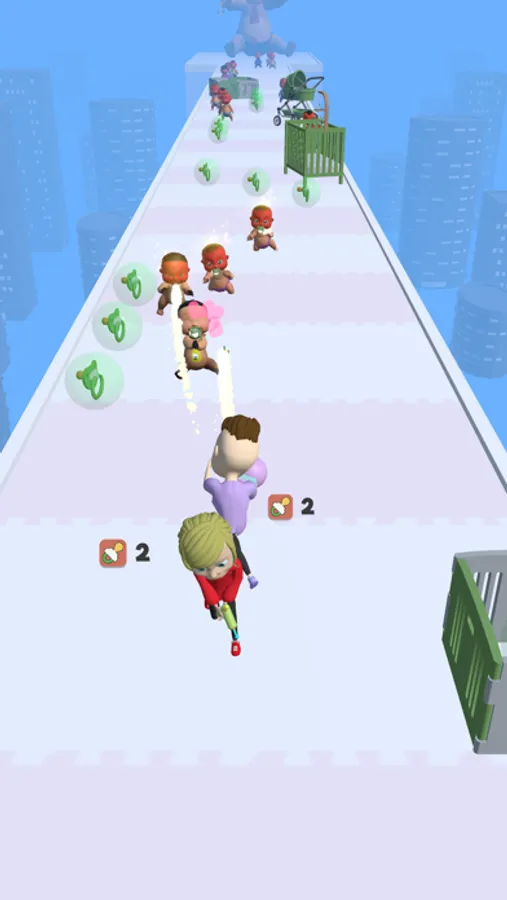 Collect the pacifiers on your way and shoot them towards the babies to calm them, nice and easy! Swipe up to rotate the parents since the only person that can collect the pacifiers, is the one behind.
