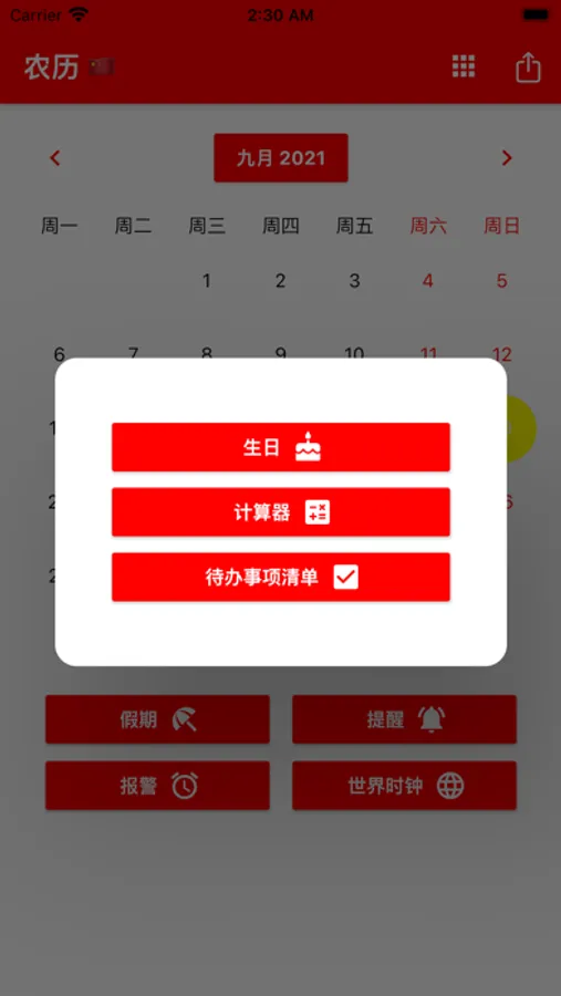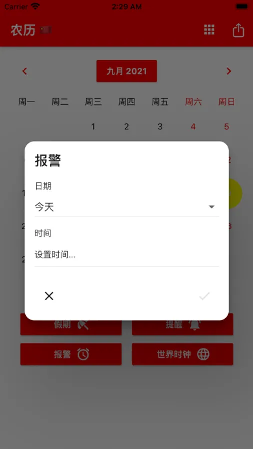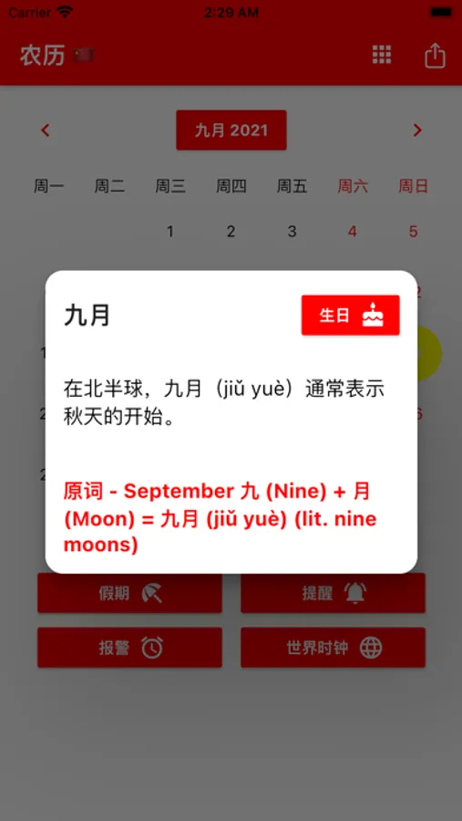 您可以设置提醒并在适当的时间收到通知。我们一定会在中国人节假日提醒您。您可以注册您的朋友和家人的生日,以便提前获得通知。包括计算器、世界时钟和闹钟等便利实用程序。世界时钟显示世界各地不同城市的时间。我们的日历包括一个带有每个月起源历史的待办事项列表。中国当地时间。 译者。