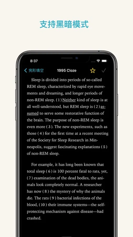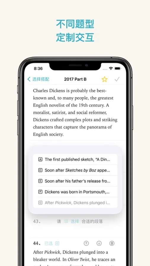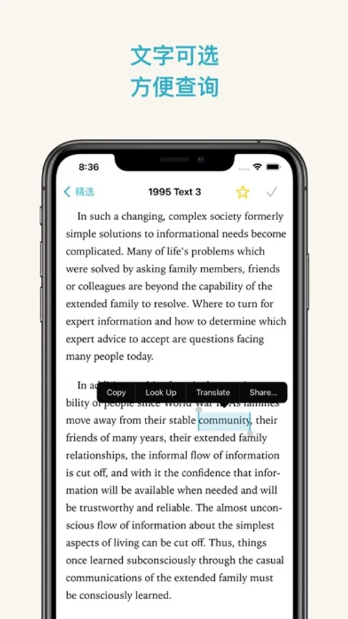 - 各视图下文章、问题、选项中单词都可选中后调用系统词典查询释义或复制