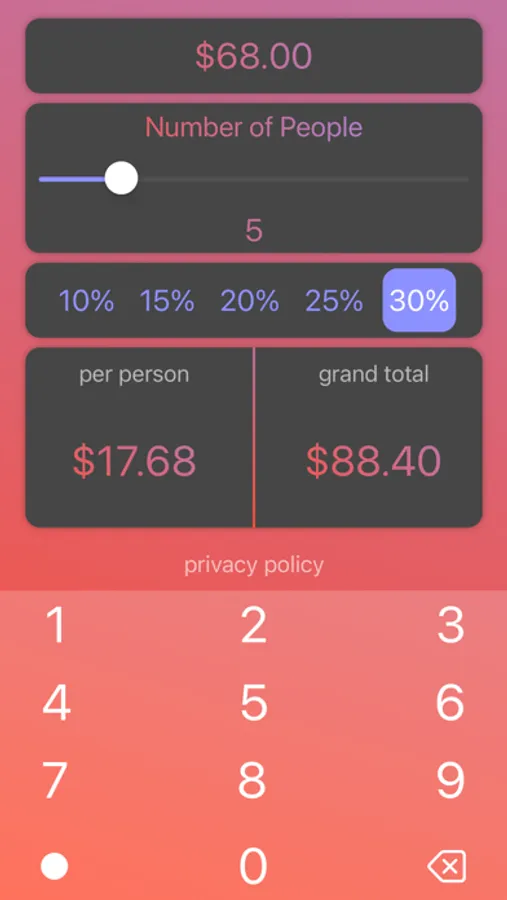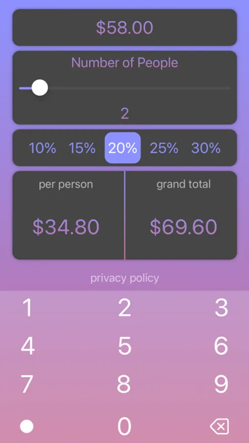 The easiest tip calculator that you can possibly use. Hands down the smoothest UI in the store. Next time you need to split a tip with a friend, just use this app! Completely Free (no ads). Keyboard in the app.