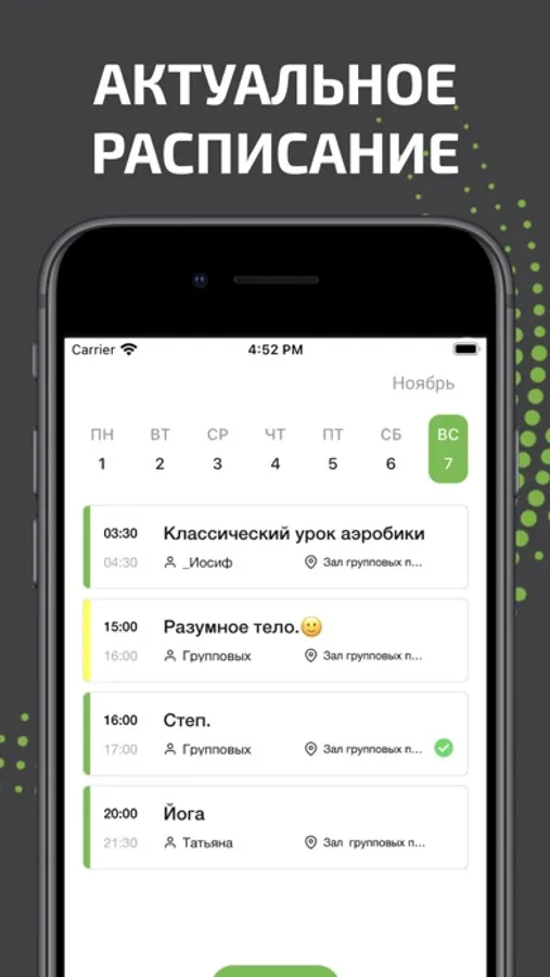 – Актуальное расписание: групповых и детских тренировок