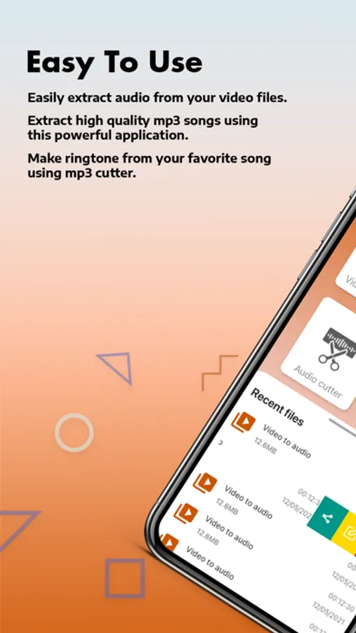 Easily extract audio from your video files . Extract high quality audio songs using this powerful application . Make ringtone from your favorite song using audio cutter . Video to Audio Converter uses ffmpeg and libmp3lame as library .