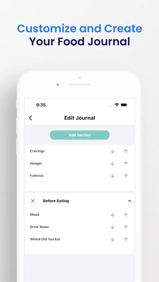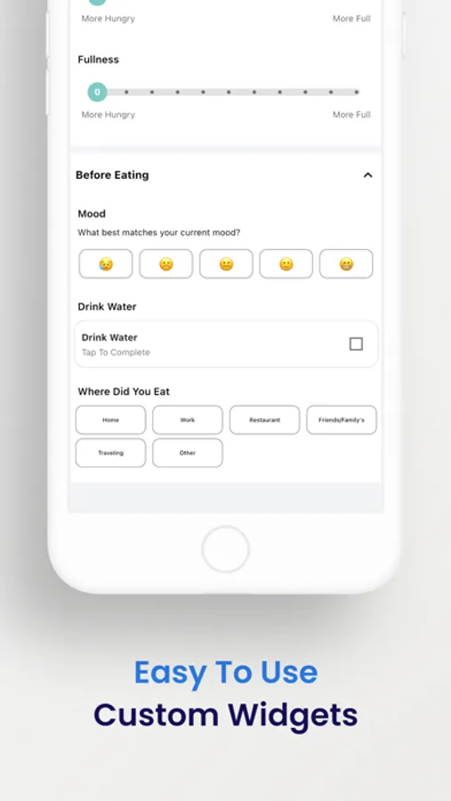 - Don’t just track what you eat. Add tracking options such as Hunger, Fullness, Why You Ate, Where You Ate, How You Feel After Eating, Mood, and more!