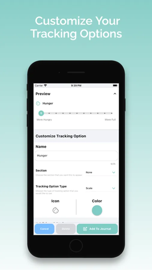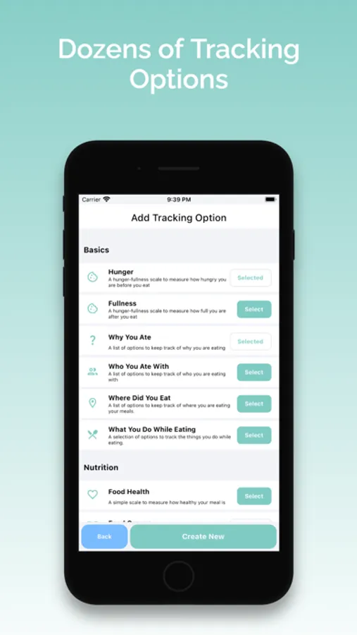 - 40+ Predefined tracking options available such as hunger/fullness, meal timer, why you ate, how you food after eating, mood tracker, who you ate with, and more