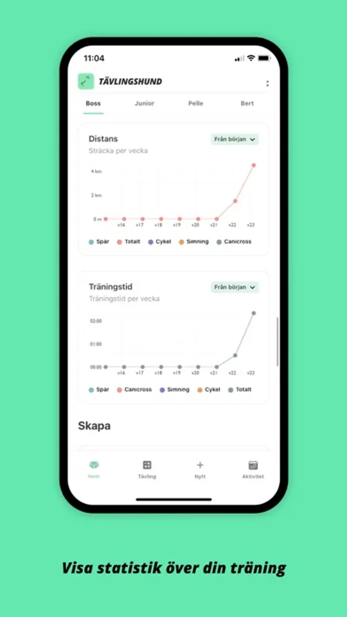 Använd graferna i appen för att utvärdera dina träningsresultat över tid. Du kan bland annat se grafer för tävlingslydnad, sök, spår och brukslydnad.