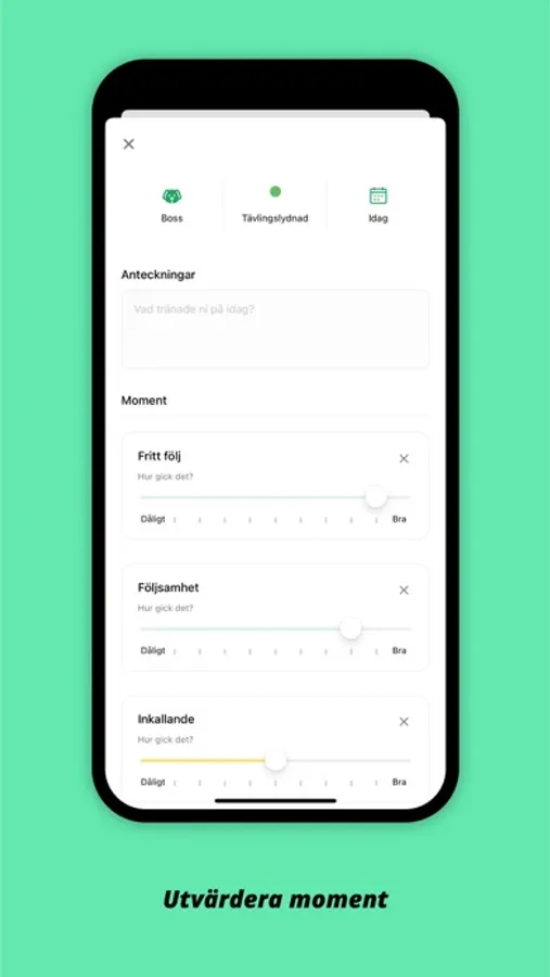 Välj vilka moment du har tränat på och gradera varje individuellt moment.