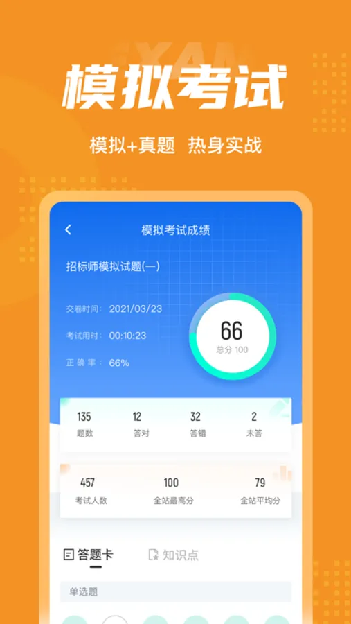 招标师题库内含考点练习,全国通用卷以及地区卷模拟练习,以及按照固定考试比重的随机式的抽题的真题考场,成绩单实时记录考试数据,一点一滴的反馈考生近期学习状态以及自我正确率的提升,大大的给予考生通过考试的信心。