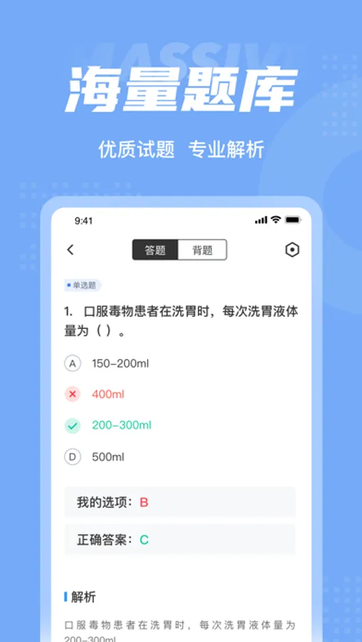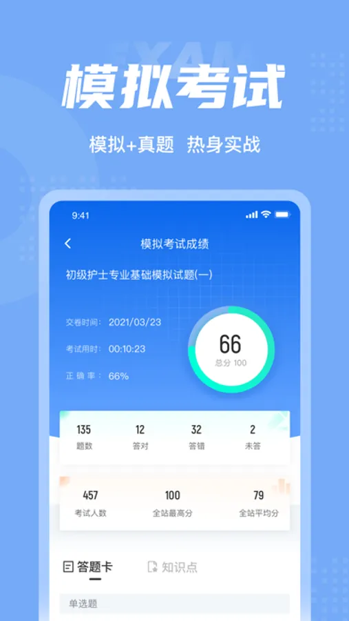 初级护士题库内含考点练习,全国通用卷以及地区卷模拟练习,以及按照固定考试比重的随机式的抽题的真题考场,成绩单实时记录考试数据,一点一滴的反馈考生近期学习状态以及自我正确率的提升,大大的给予考生通过考试的信心。
