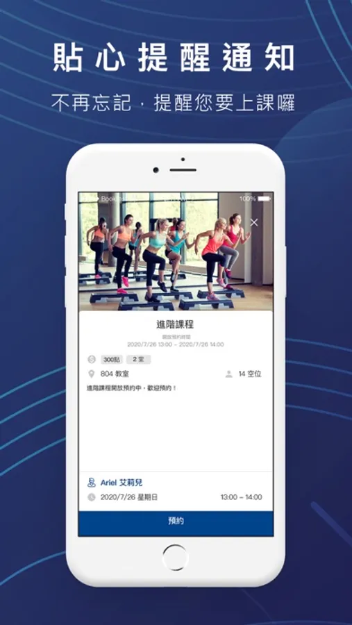 支援上課前推播提醒,生活忙碌也不忘準時上課,專屬行事曆,喬時間不再是難事,可隨時查看行程状態、取消預約、課程紀錄讓你一目了然,即時加入至手機內建行事,無縫整合個人行程使用虛擬課卡,清楚掌握上課簽到情況,快速核對剩餘課程堂數