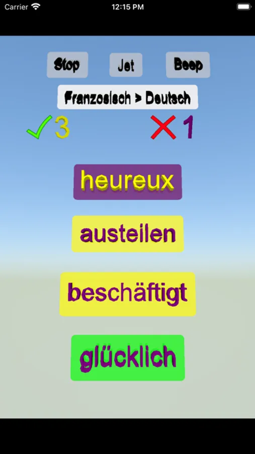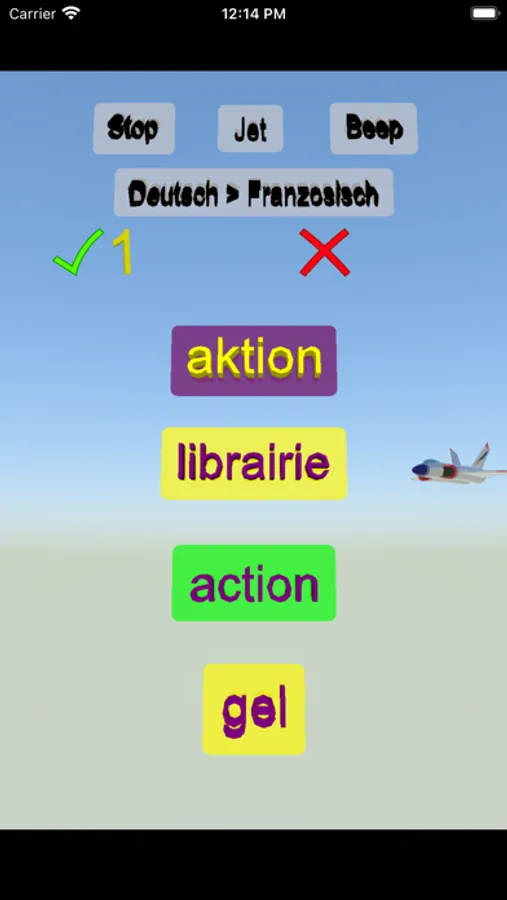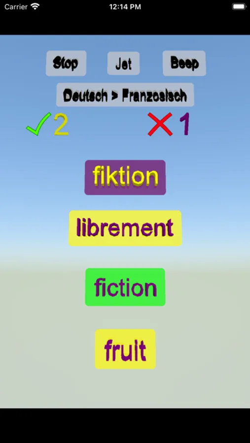 Sie sehen oben ein Wort und Antworten unterhalb des Wortes. Sie sehen einen grünen Rahmen, wenn Sie die richtige Antwort auswählen. Sie können das Spiel von Deutsch auf Französisch und von Französisch auf Deutsch ändern. Mit richtigen Antworten können Sie Ihre Punkte erhöhen.