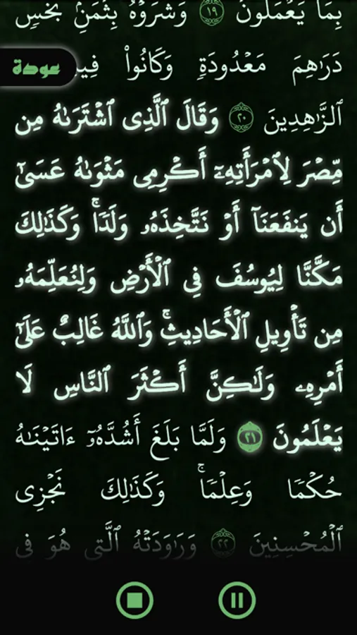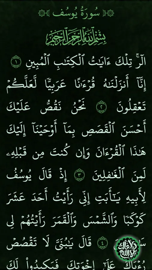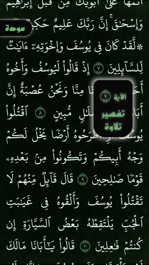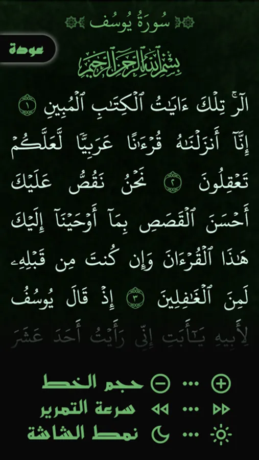هذا التطبيق لتسهيل قراءة سورة يوسف وتدبرها ويتضمن العديد من المزايا كالتمرير التلقائي لقراءة مبسطة وميسرة فضلا عن التحكم بحجم الخط وسرعة التمرير وألوان الشاشة بما يتناسب مع متطلبات التشغيل المختلفة وتم تضمين تلاوة عطرة للقارئ محمد أيوب رحمه الله تعالى.