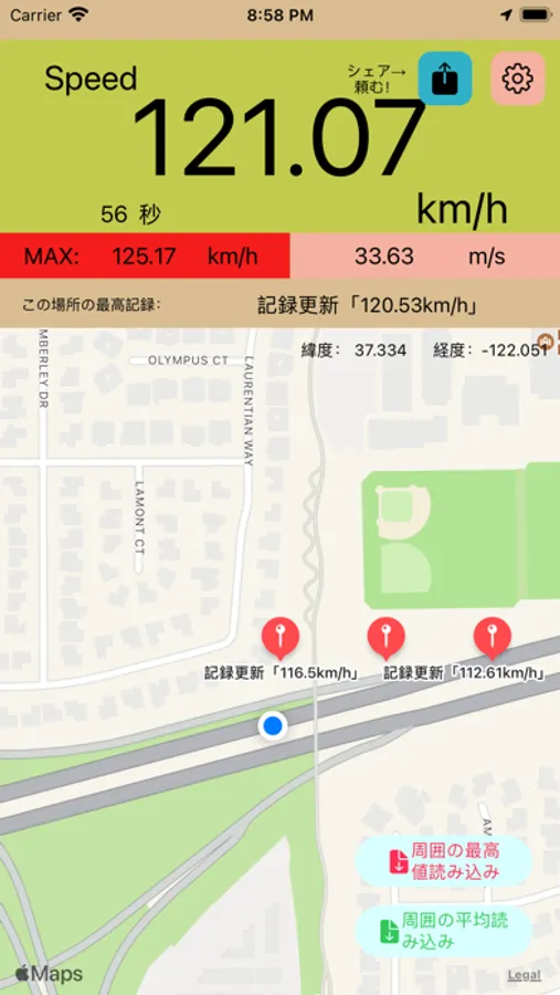 また、自分の現在付近の位置の全ユーザーの最高速度を確認する事ができます。