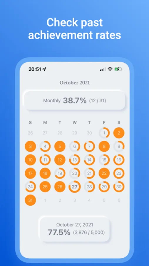 You can also use the calendar to see the number of steps you have taken in the past and the percentage of your target achieved.