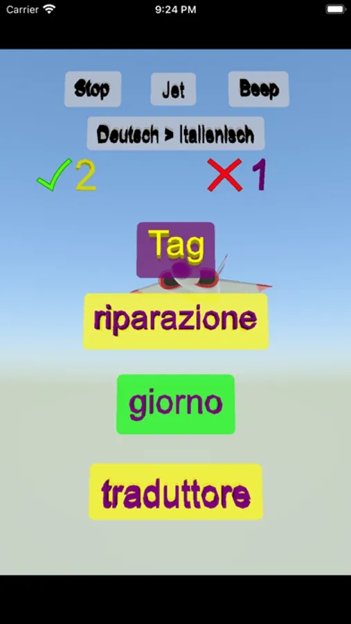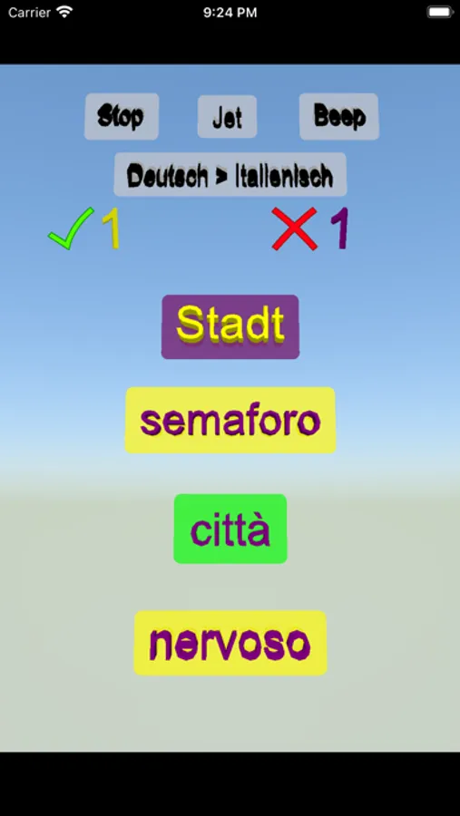 Sie sehen oben ein Wort und Antworten unterhalb des Wortes. Sie sehen einen grünen Rahmen, wenn Sie die richtige Antwort auswählen. Sie können das Spiel von Deutsch auf Italienisch und von Italienisch auf Deutsch ändern. Mit richtigen Antworten können Sie Ihre Punkte erhöhen.