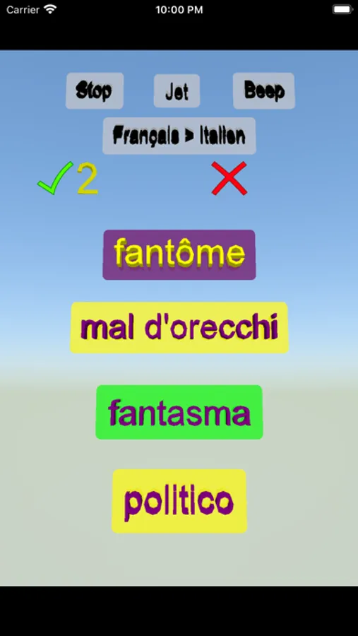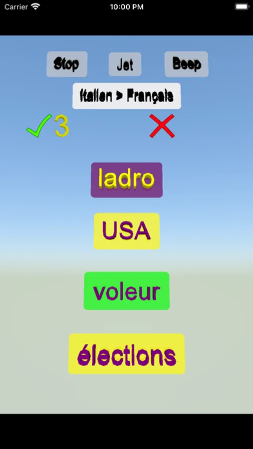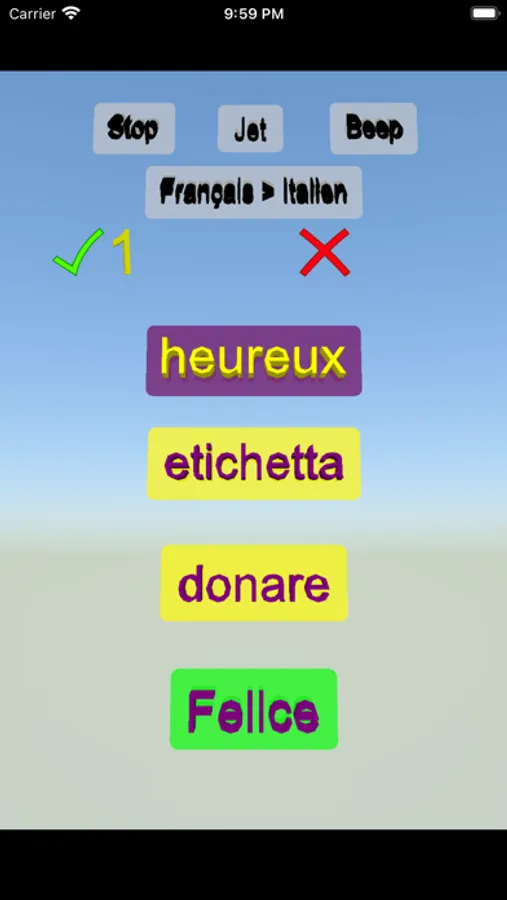Vous verrez un mot en haut et des réponses en dessous du mot. Vous verrez une bordure verte si vous sélectionnez la bonne réponse. Vous pouvez changer le jeu du français à l'italien et de l'italien au français. Vous pouvez augmenter vos points avec des réponses correctes.