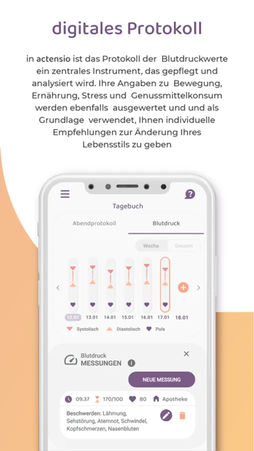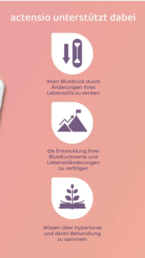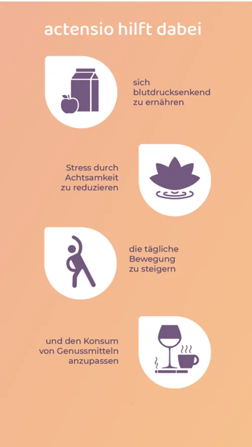 actensio ist eine digitale Anwendung für Patient:innen mit Bluthochdruck (Hypertonie), die auf den offiziellen Behandlungleitlinien der Deutschen Gesellschaft für Hypertonie beruht. Die Anwendung leitet Sie zu wirksamen Änderungen Ihres Lebensstils an, die zu einer Normalisierung des Blutdrucks beitragen, das Risiko für kardiovaskuläre Erkrankungen verringern und die Notwendigkeit einer medikamentösen Therapie verringern oder hinauszögern können. Bei medikamentös behandelten Patient:innen können Lebensstil-Interventionen die Wirkung der blutdrucksenkenden Medikationstherapie verstärken.