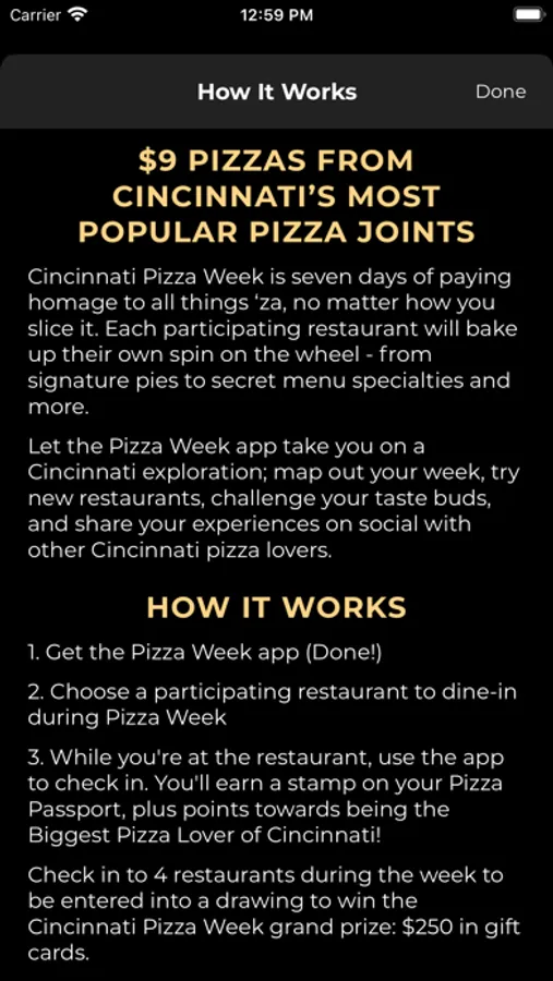 Let the Pizza Week app take you on a Cincinnati exploration; map out your week, try new restaurants, challenge your taste buds, and share your experiences on social with other Cincinnati pizza lovers.