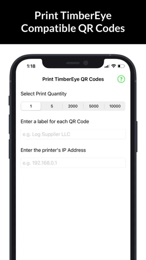 To connect your printer to the app, plug one end of an ethernet cable into your router and the other end into the back of your Zebra printer. Read the IP Address displayed on the front of your printer, and enter that IP Address into the TimberEye QR Printing app. The app will establish a connection to your printer, enabling you to print from your phone.