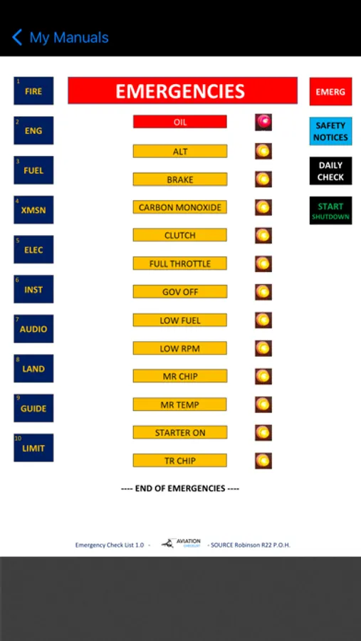 The easy to use buttons on the right will guide you to any emergency drill or start/shutdown checklist. On the left we have created a system menu which you can use to brush up on knowledge or just browse through aircraft systems.