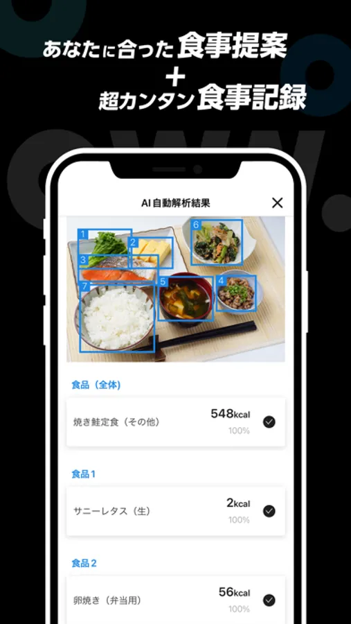 AIによる自動写真解析が、食事プランの遂行を飛躍的に簡単にします。一般的な料理やチェーン店、ラーメン店などの情報も登録されているので、手間なく食事のレコーディングができます。また、記録された内容をベースに、摂ってほしい栄養素をシンプルに表示するので、あれこれ考える必要がなく、ゲーム感覚で食事管理ができます。