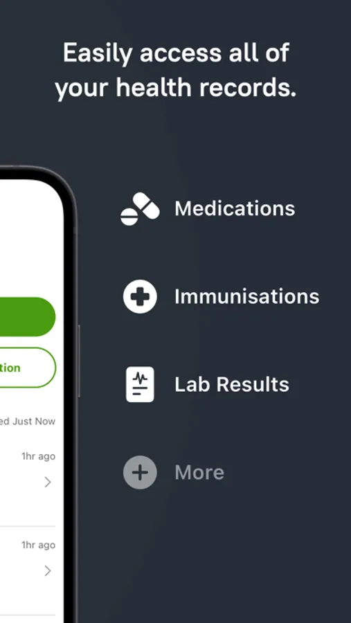 - Access your health summary, including diagnosed conditions, prescribed medications, immunisation history, and lab results