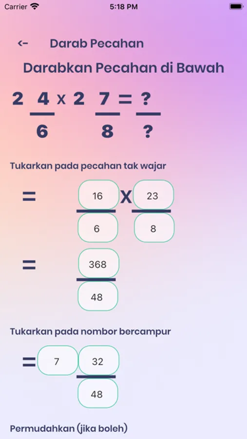Aplikasi interaktif Matematik Tahun 6 ini dapat membantu pelajar untuk mahir matematik dengan mudah kerana fungsi papar dan semak jawapan. boleh digunakan secara Offline dimana sahaja. dapat mengurangkan tekanan pada pelajar dan ibu bapa. sesuai untuk cara pembelajaran terkini menggunakan teknologi digital.