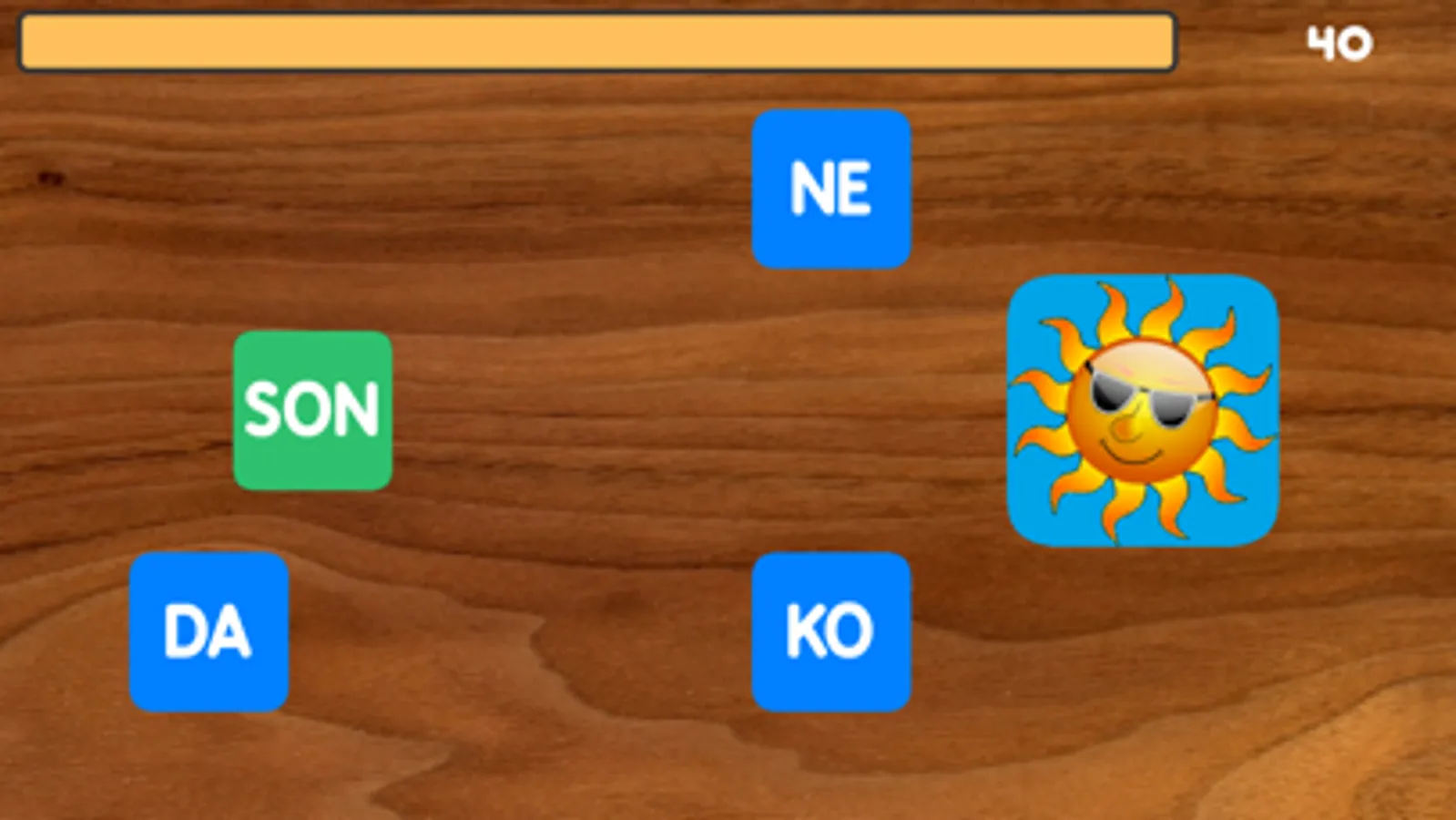Ein Spiel, um leicht deutsche Silben zu lernen. Tippen Sie die richtigen Silben an, um das Wort zu bilden, das Ihnen vorgelegt wird! Wenn Sie ein Wort richtig gebildet haben, geht's mit einem neuen Wort weiter. Viele verschiedene Wörter zum Spielen und Lernen, die alle aus zwei oder drei Silben bestehen.