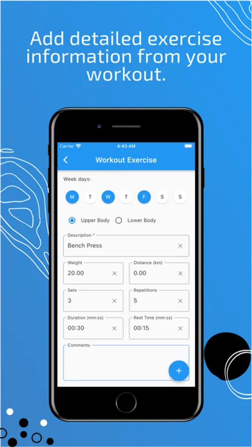 To add a training exercise you must enter its name or description and select the days of the week on which the exercise will be performed. Other information you can add are: the amount of sets, repetitions, weight, distance and duration time and rest time to better control the time together of the timer present in the application.
