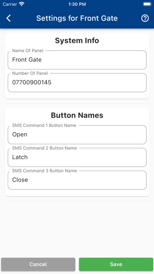 Use these big buttons on your smartphone to send SMS commands to your entry system to open your entrances. Add as many systems as you like.