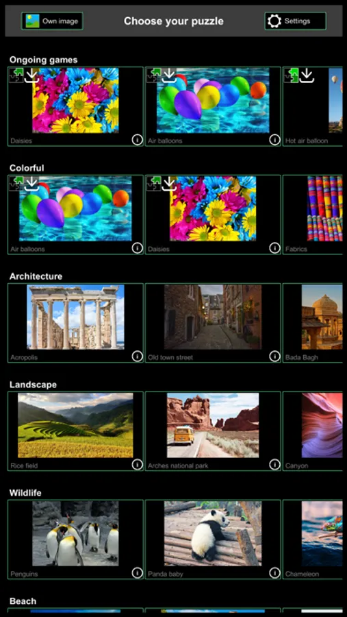 Solve jigsaw puzzles. Select picture from numerous categories or use your own image to solve.