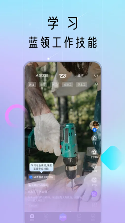 学习:通过专业视频、直播讲解、提问请教、同行交流等方式进行学习,鼓励用户在学习的同时,创作更多的高质量学习视频,通过不断的相互交流,相互受益,提高蓝领各个行业的整体水平。
