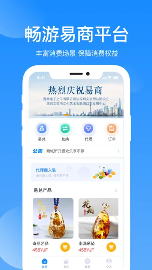 易商平台旨在打通中国实体产业市场流通瓶颈,促进市场资源合理高效配置,赋能中国实体产业。坚持全面贯彻“文化强国”战略,深化供给侧改革,优化消费场景,落地丰富应用场景,助力解决实体产业资金短缺、产/商品流通流转难等问题。创新市场消费,带动大众就业,促进贸易发展,对包括相关资产产业链上中下游企业进行上架产/商品市场招募、孵化、上架、兑换流转、提货配送、合规互联网技术改造应用,以促进相关资产/产品/商品低成本、高效率流通,达到扶持相关企业快速成长为目的。