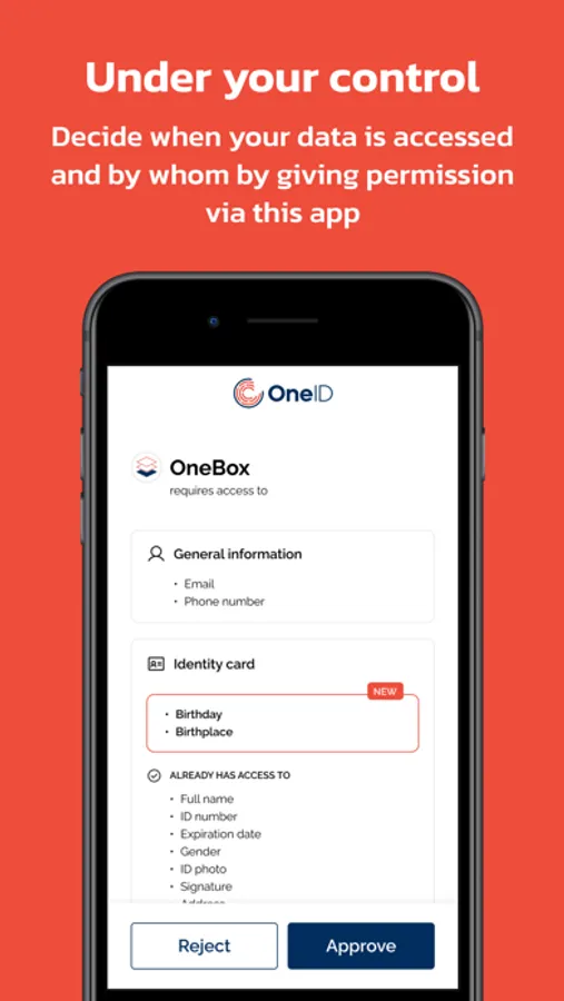 Your personal data is fully encrypted with a unique key stored on your mobile device. Only you decide who can access your data—and when—by giving permission via OneID. Just sign up, create an account, and validate one of your IDs. You can also backup and recover the account at any time.
