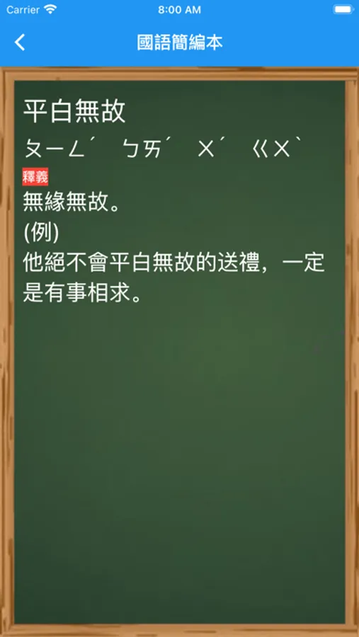 國字頁面有注音(多音字)、部首、筆畫、釋義、例句等資訊,