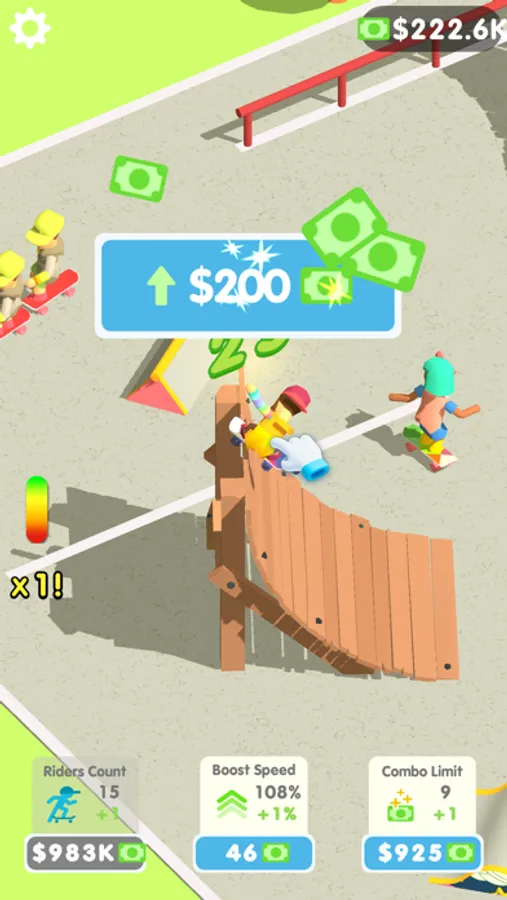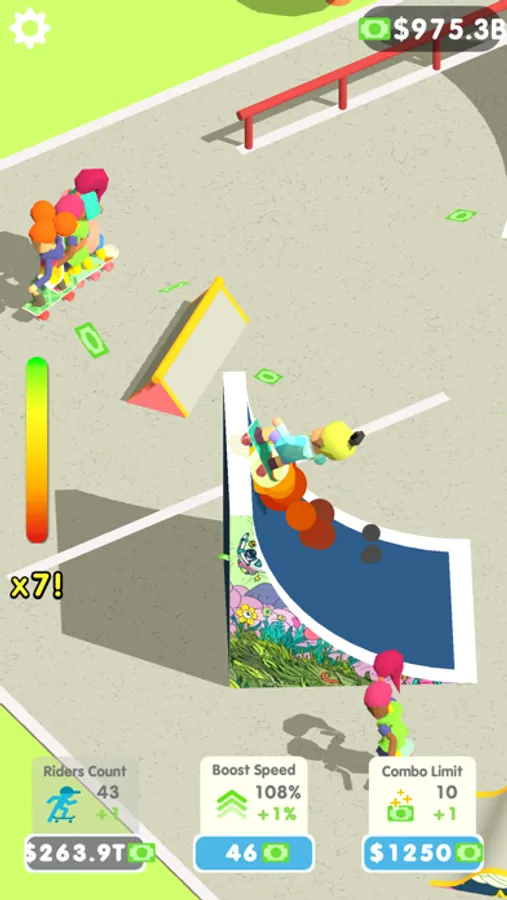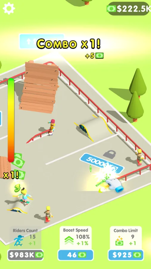 You can interact with the riders by clicking on them which will start and continue combo tricks which will be repeated with different tricks until you click on them or until you reach the maximum combo available to you. The trick combos themselves bring in extra income.