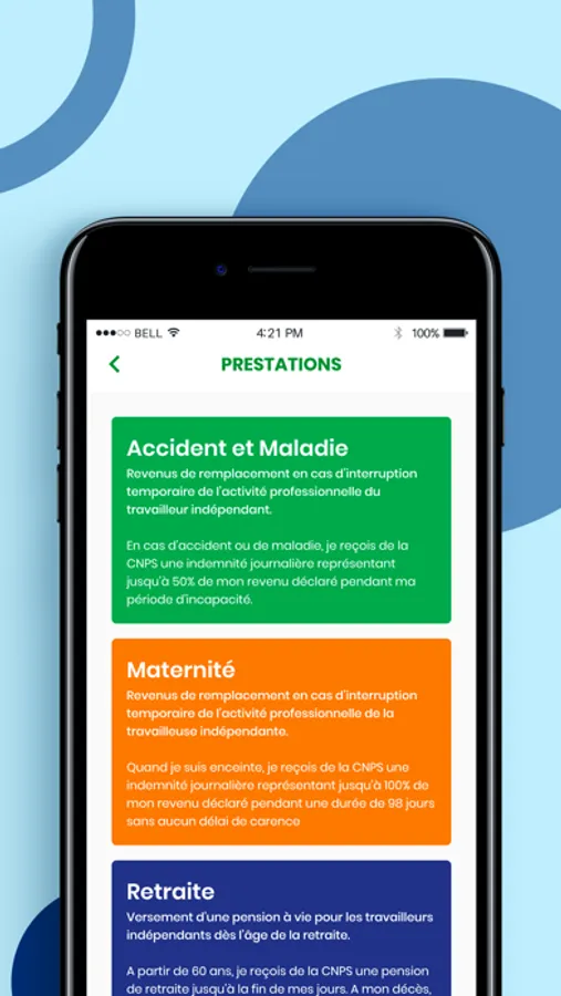 En cas de maternité, la bénéficiaire reçoit de son revenu déclaré pendant 98 jours. A la retraite, le travailleur indépendant bénéficie dès 60 ans d’une pension de retraite qui lui est versée à vie .En cas de décès, cette pension est reversée sous conditions à ses ayants droits.