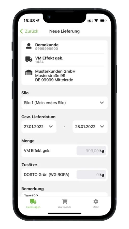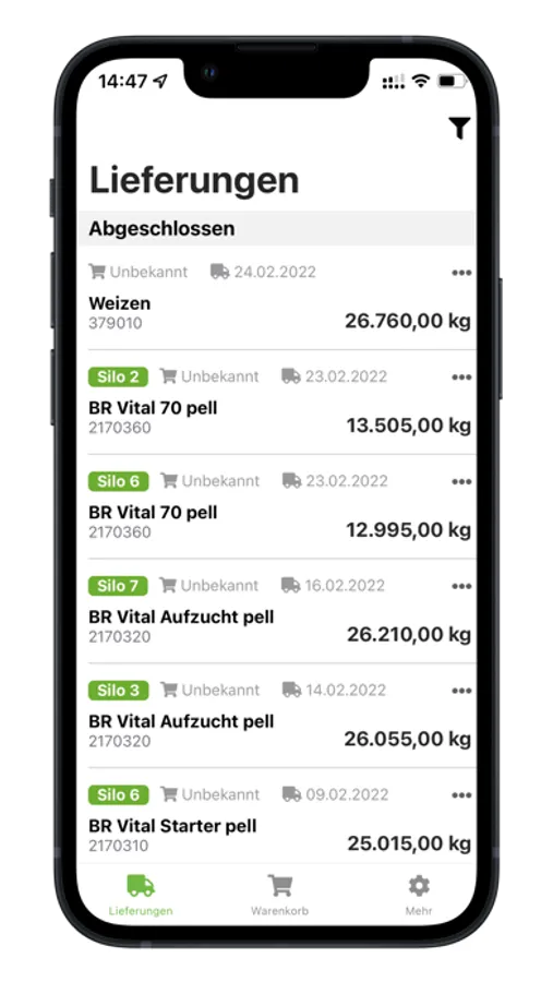 Sie suchen sich aus Ihren Lieferungen das Futter aus, welches Sie bestellen wollen. Anschließend geben Sie die gewünschte Liefermenge sowie das gewünschte Lieferdatum an und fügen die Bestellung Ihrem Warenkorb zu. Nach Kontrolle des Warenkorbs senden Sie diesen ab und das war's. Ab jetzt werden Sie per Pushnachricht über den Bestellstatus informiert.